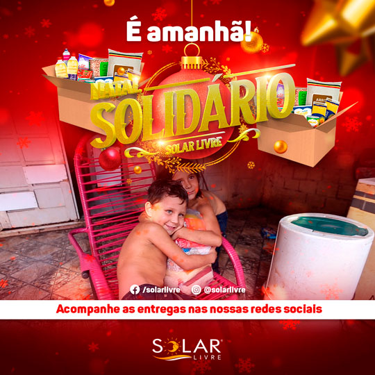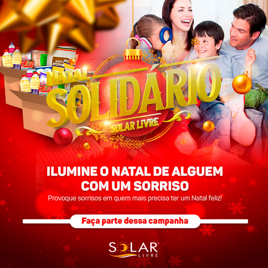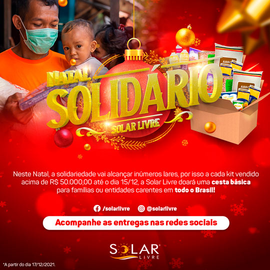 Neste natal, a solidariedade vai alcançar inúmeros lares, por isso a cada kit vendido acima de R$ 50.0000,00 a Solar Livre doará uma cesta básica para famílias ou entidades carentes em todo Brasil.